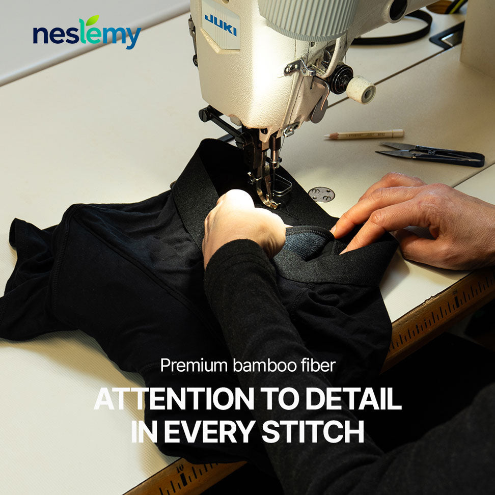 Neslemy boxer briefs use NESLEMY® certified materials in a 9-layer system. The main body is 95% bamboo and 5% spandex for comfort. The absorption layers combine bamboo and polyester for moisture management, with a waterproof nano-polyester backing to prevent leaks.