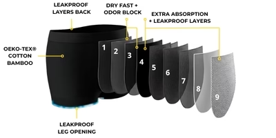 Inside is our Boxer Briefs 9-Layer System: it catches leaks instantly, absorbs fast, blocks odors, and stays thin. On the outside, breathable, skin-friendly bamboo that keeps you cool, fresh, and comfortable all day.